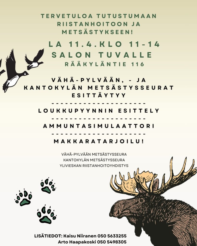 Perinteiset hirvipeijaiset järjestetään Salontuvalla lauantaina 31.1.2026 klo 11.00 - 14.00.Tervetuloa seuran jäsenet perheineen, …